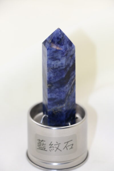 選用天然藍紋石能量柱,晶體呈現深藍與白色紋理交錯,