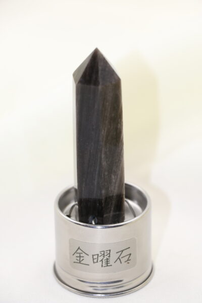 選用天然金曜石能量柱,黑色中閃爍金色光點,