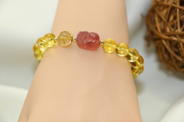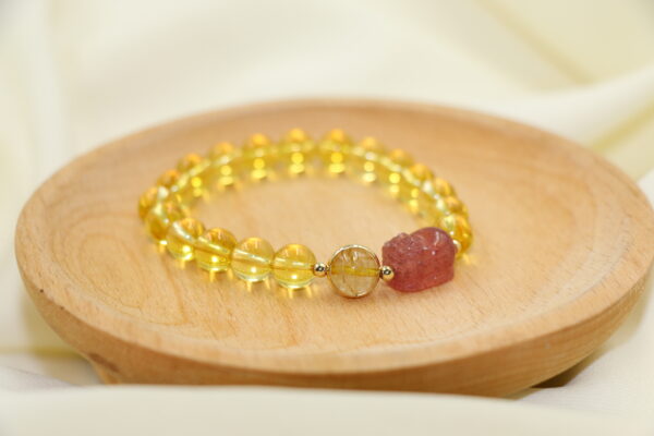 將草莓晶的浪漫能量與黃水晶的陽光磁場融合於腕間,像是隨身攜帶「愛情+財富」的雙重祝福。無論日常搭配或重要場合,都能展現甜美氣質與自信光芒,讓好人緣與好財運同步加持。