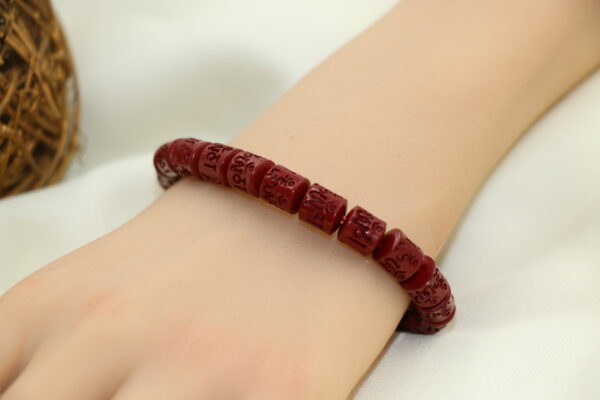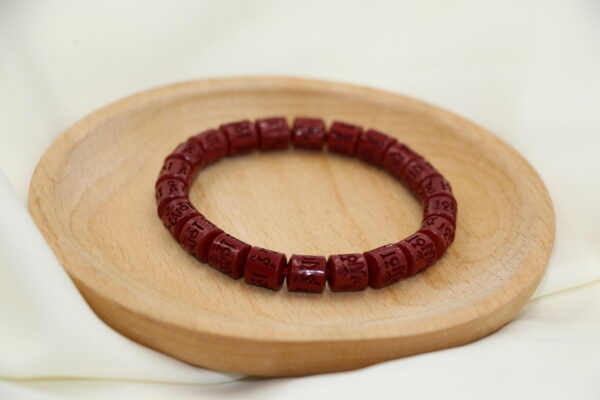 硃砂紅色寓意吉祥富貴,助益事業與財運。六字大明咒「唵嘛呢叭咪吽」蘊含智慧與慈悲力量。